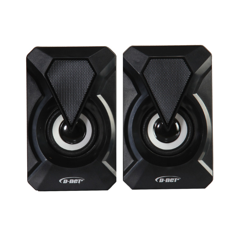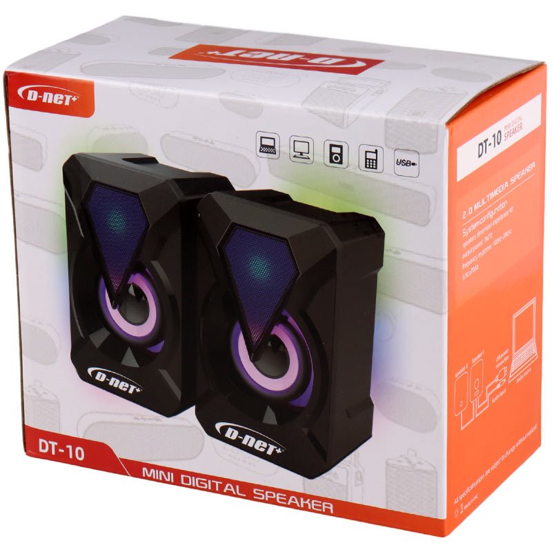 اسپیکر دو تکه دی نت قابلیت اتصال به لپ تاپ و کامپیوتر را دارد و دارای نور پردازی زیباییست که جذابیت محصول را دو چندان کرده و برای مصارف خانگی مناسب است.