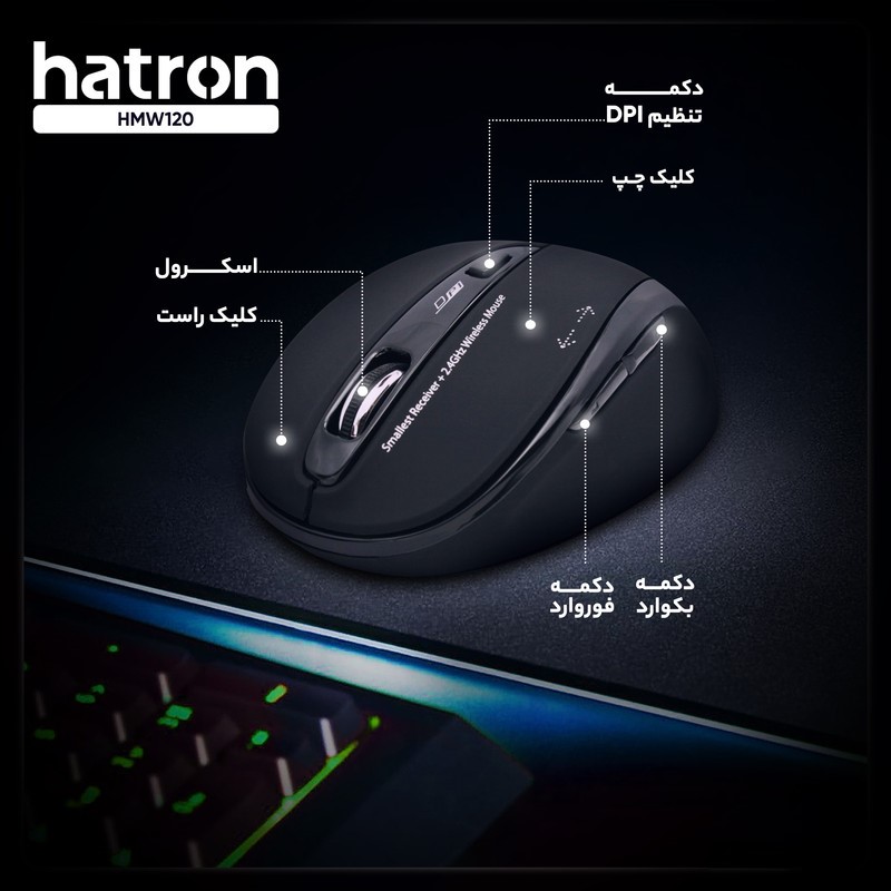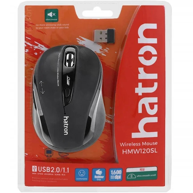 برند Hatron یکی از بهترین تولیدکنندگان موس و کیبورد و سایر لوازم جانبی در ایران است. ماوس «HMW120SL» از سری موسهای هترون است که بیصدا و بسیار خوشساخت است. این ماوس دارای 5 کلید بوده و نوع اتصال آن به سیستم از طریق دانگل مخصوص است. طراحی ارگونومیک زیبا و شیک این ماوس برای استفاده با دست راست طراحی شده است که از فشار بیمورد بر دست جلوگیری میکند و بهراحتی در دست قرار میگیرد. ماوس HMW120SL دارای کلید DPI Switch بوده و در سه سرعت 1200،800 و 1600 قابلتنظیم است. وجود کلید های Back و Forward روی موس سبب راحتی و سرعت عمل در کار با سیستم عامل و ویگردی می شود. فرکانس این ماوس برابر 2٫4 گیگاهرتز است و تا 10 متر مسافت را پشتیبانی میکند. بهاینترتیب برای کنترل سیستم کامپیوتری خود، محدود به میز کار نبوده و بهراحتی از فاصله دور هم قادر به انجام کارهای کامپیوتری خود هستید. انرژی موردنیاز این ماوس از طریق دو عدد باتریقلمی AA تامین میشود. ویژگی بارز این مدل قابلیت Auto Power است که سبب صرفه جویی در مصرف باتری و طول عمر آن می شود. این ماوس با تمامی سیستمعاملهای رایج سازگاری دارد طراحی آن مینیمال و ساده، و برای سیستمهای خانگی، اداری و بانکها انتخاب مناسبی به شمار میآید و توانسته در بین کاربران سیستمهای کامپیوتری توجه بسیاری از افراد را جلب کند. این ماوس دارای رنگبندی است و در رنگ های مشکی و سفید تولید و به بازار عرضه میشود.