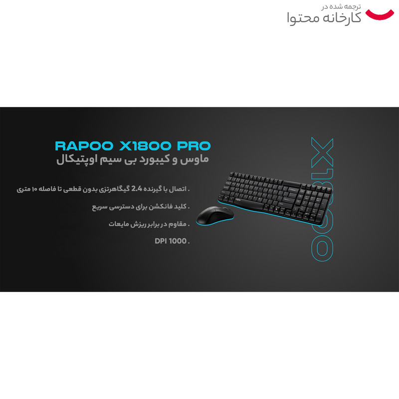 این روزها استفاده از لوازم کامپیوتری تقریباً برای اکثر افراد تبدیل به امری روزمره و اجتنابناپذیر شده است. کامپیوترها نقش غیرقابلانکاری را در زندگی شخصی و کاری ما انسانها به عهده دارند. این موضوع سبب شده انتخاب و استفاده از لوازم کامپیوتری باکیفیت، خوشساخت و مقاوم از اهمیت زیادی برخوردار باشد. بدیهی است یکی از متعلقات کامپیوتر که کاربر بیشترین استفاده را بهصورت مستقیم از آن انجام میدهد کیبورد است و شاید ساعتها در روز دستان شما روی صفحه کیبورد قرار بگیرد. محصول «X1800 Pro» یکی از کیبوردهای کاربردی و خوشساخت ارائهشده به بازار توسط شرکت «رپو» (Rapoo) است. این کیبورد زیبا و مقاوم خصوص کاربردهای روزانه ، خانگی ، اداری و حتی بازی طراحی شده است. و از طریق اتصال دانگل بی سیم USB به کامپیوتر وصل میشود. ماوس موجود در این مجموعه فوق العاده از کیفیت بالای 1000Dpi برخوردار است