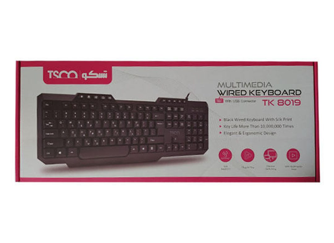 کیبورد تسکو مدل TK 8019 یک صفحهکلید فولسایز مخصوص بازی است که با استفاده از سوییچهای سیزر از نوع ممبران، عملکردی نرم و پاسخگو ارائه میدهد. این کیبورد با ابعاد ۴۵۰ در ۲۶ در ۱۷۰ میلیمتر و وزن ۴۶۵ گرم، دارای بدنهای از پلاستیک با دوام است. طراحی آن به گونهای است که پایههای قابل تنظیم و ضد لغزش، ثبات و راحتی استفاده در جلسات طولانی بازی یا تایپ را تضمین میکند. حروف فارسی روی کلیدها حک شده است تا تجربه تایپ برای کاربران فارسیزبان بهبود یابد. این کیبورد از طریق کابل USB با روکش پلاستیکی به طول ۱۸۰ سانتیمتری و اتصال Plug & Play به سیستم وصل میشود و با تمامی سیستمعاملهای ویندوز، مک، لینوکس و اندروید سازگار است. همچنین دارای نورپردازی پسزمینه LED RGB است که کل سطح کیبورد را پوشش میدهد و جلوهای مدرن به آن میبخشد. تعداد کلیدهای این کیبورد ۱۱۴ عدد بوده و عمر ضربهپذیری آن تا ۱۰ میلیون کلیک اعلام شده است. علاوه بر این، مجموعا ۱۲+۱۰ کلید میانبر برای دسترسی سریع به عملکردهای گیمینگ تعبیه شدهاند.