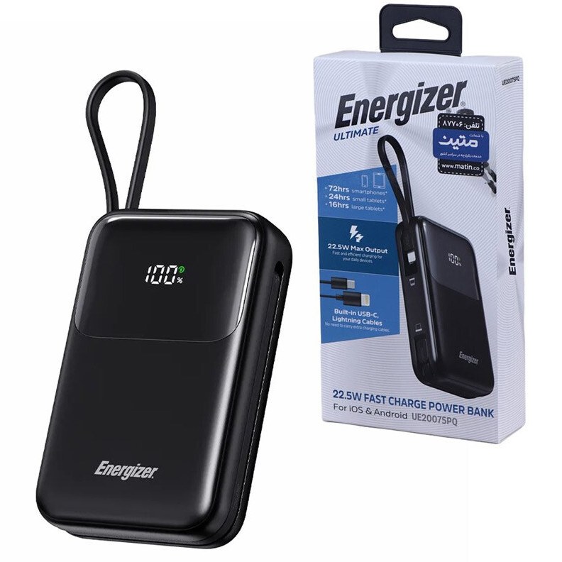 پاوربانک مدل UE20075PQ از سری پاوربانکهای 20000 میلیآمپر کمپانی انرجایزر است و با بکارگیری فناوری فست شارژ به منظور شارژ رسانی سریع به تلفنهای هوشمند با سیستم عامل اندورید و iOS و تبلتها تولید شده است. پاوربانک UE20075PQ دارای 4 درگاه میباشد که شامل یک پورت مشترک ورودی/خروجی تایپ سی، یک کابل خروجی تایپ سی، یک پورت خروجی USB-A و یک کابل خروجی لایتنینگ (آیفون) است. درگاه ورودی به همراه نرخ ولتاژ و جریان آن عبارت است از: پورت Type-C ورودی: 5V/3A – 9V/2A – 12V/1.5A نرخ ولتاژ و جریان درگاههای خروجی این کالا نیز عبارتند از: پورت USB-A خروجی: 5V/3A پورت Type-C خروجی: 5V/3A – 9V/2.22A – 12V/1.67A کابل Type-C خروجی: 4.5V/5A – 5V/4.5A – 5V/3A – 9V/2A – 12V/1.5A کابل Lightning خروجی: 5V/2.4A – 9V/2.2A این پاوربانک با حداکثر توان خروجی 22.5 وات دارای نمایشگر دیجیتال LCD جهت نمایش میزان شارژ است. همچنین این محصول دارای وزن 366 گرم است که در کلاس وزنی پاوربانکهای سبک وزن قرار دارد. ابعاد این شارژر همراه نیز 119.5 × 75.7 × 29.5 میلیمتر است. این پاوربانک در رنگ مشکی با ظرفیت 20000 میلی آمپر دارای باتری لیتیوم پلیمری است. همچنین این کالا از رویه ضد خش و جنس بدنه آن نیز پلاستیک ABS است که مهمترین خاصیت آن ضد اشتعال بودن کالاست. از اقلام همراه این پاوربانک فست شارژ نیز میتوان به دفترچه راهنما و کابل شارژر اشاره کرد.