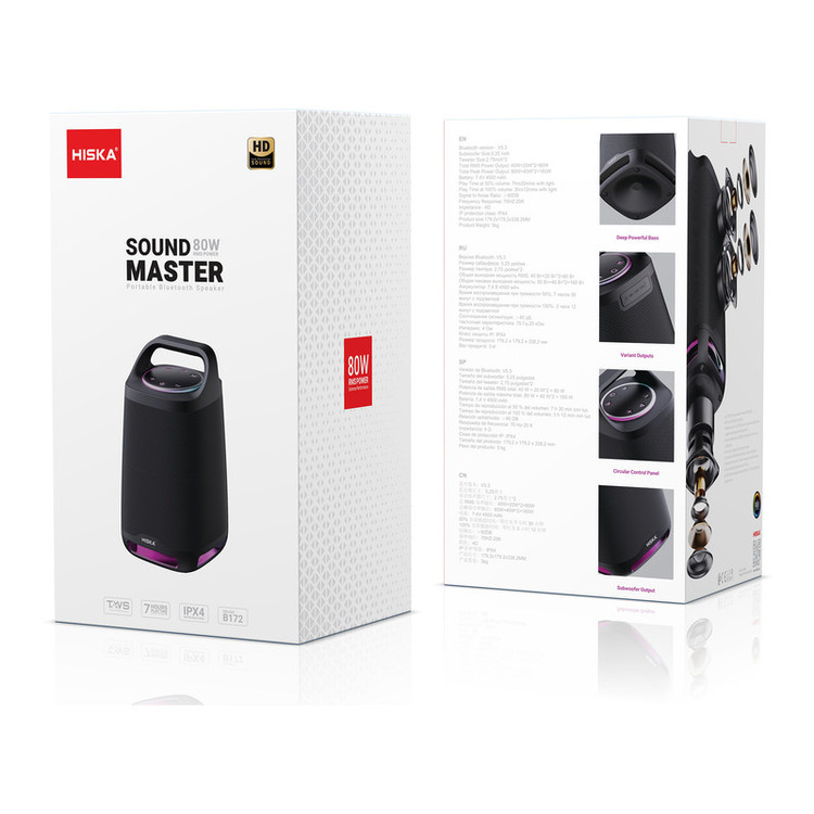اسپیکر بلوتوثی قابلحمل HISKA مدل B172 یک دستگاه پیشرفته و چندمنظوره است که بهطور ویژه برای علاقهمندان به موسیقی و برگزارکنندگان مهمانیهای پرهیجان طراحی شده است. این اسپیکر با توان خروجی RMS 80 وات (شامل یک سابووفر 5.25 اینچی و دو توییتر 2.75 اینچی) صدایی شفاف و قدرتمند با باس عمیق و تأثیرگذار ارائه میدهد. علاوه بر آن، حداکثر توان خروجی پیک این اسپیکر به 160 وات میرسد که آن را به گزینهای ایدهآل برای محیطهای باز و مهمانیها تبدیل میکند. مدل B172 دارای طراحی مدرن و ارگونومیک است که شامل یک دسته مقاوم از جنس ABS میشود و حمل آن را بسیار آسان کرده است. بدنه اسپیکر با پارچهای شیک و مقاوم پوشانده شده که علاوه بر زیبایی، در برابر خطوخش و استفاده مداوم نیز مقاوم است. این طراحی هوشمندانه با استاندارد IPX4 ترکیب شده تا محصول را در برابر پاشش آب و رطوبت مقاوم کند؛ بنابراین، استفاده از آن در محیطهای بیرونی کاملاً ایمن و بدون نگرانی خواهد بود. این اسپیکر به نسخه بلوتوث 5.3 مجهز است که علاوه بر اتصالی پایدار و سریع، از ویژگی TWS (True Wireless Stereo) پشتیبانی میکند. این فناوری به شما اجازه میدهد تا دو اسپیکر مدل B172 را بهطور همزمان به هم متصل کنید و یک صدای استریوی واقعی و فراگیر ایجاد کنید. همچنین، اسپیکر از ورودیهای متنوعی مانند USB-Flash، AUX و میکروفون پشتیبانی میکند و حالتهای پخش متعددی را در اختیار کاربران قرار میدهد. نورپردازی RGB محیطی با 5 رنگ مختلف که بهصورت هماهنگ با ریتم موسیقی تغییر میکند، جذابیت این محصول را دوچندان کرده است. این ویژگی تجربهای هیجانانگیز را برای مهمانیهای شبانه و استفادههای تفریحی به همراه دارد. باتری لیتیومی داخلی 4500 میلیآمپر ساعتی اسپیکر HISKA مدل B172 با یک بار شارژ کامل، امکان پخش مداوم موسیقی را برای 7 ساعت در حجم 50 درصد و حدود 3 ساعت در حجم 100 درصد (همراه با نور) فراهم میکند. همچنین، این باتری از شارژ سریع با درگاه Type-C پشتیبانی میکند که زمان شارژ را بهطور قابلتوجهی کاهش میدهد. این اسپیکر علاوه بر امکانات صوتی پیشرفته، از دستیارهای صوتی Google و Siri نیز پشتیبانی میکند که راحتی کار با آن را دوچندان میکند. از این ویژگی میتوانید برای دستورات صوتی سریع و بیدردسر استفاده کنید.